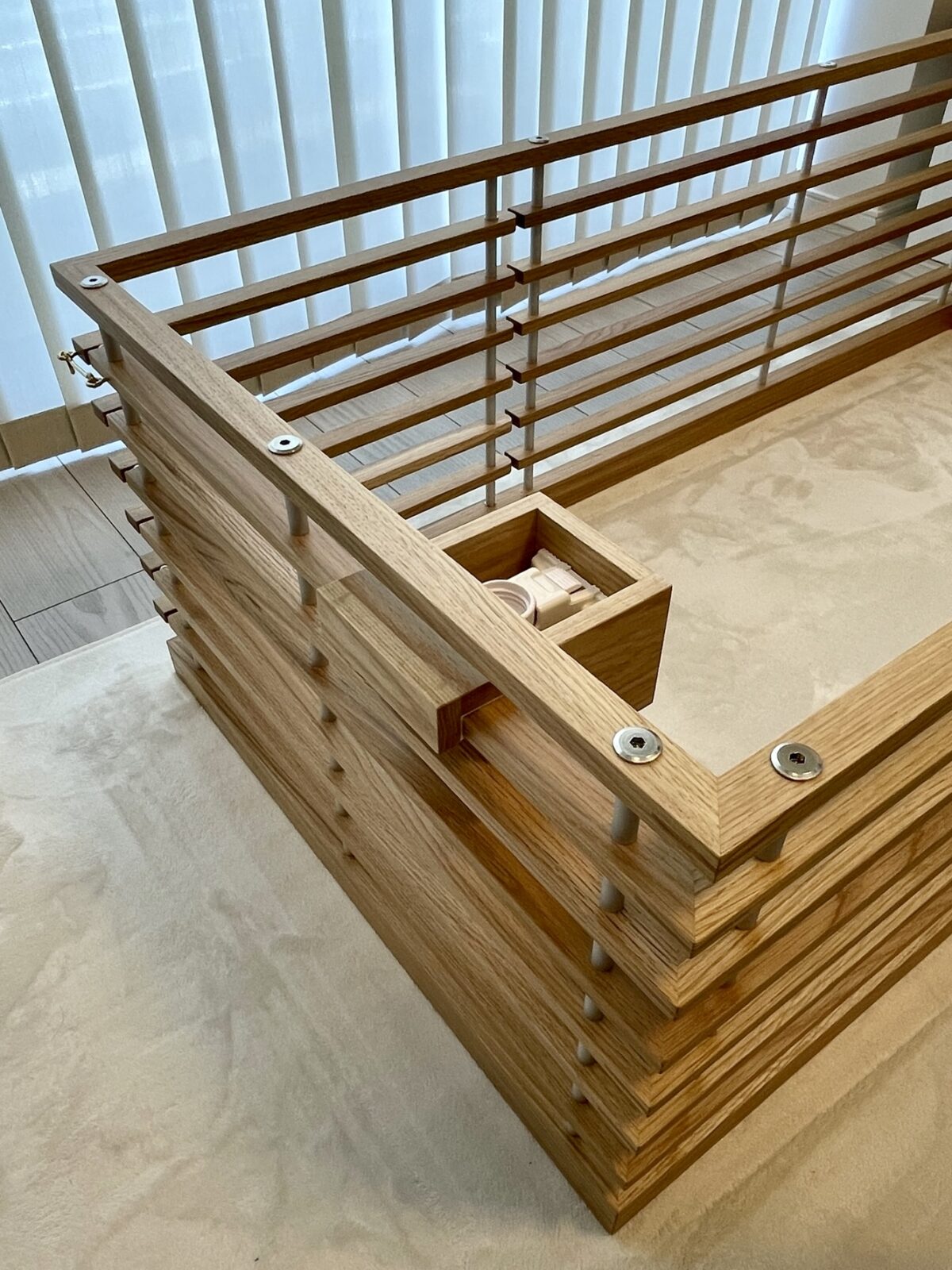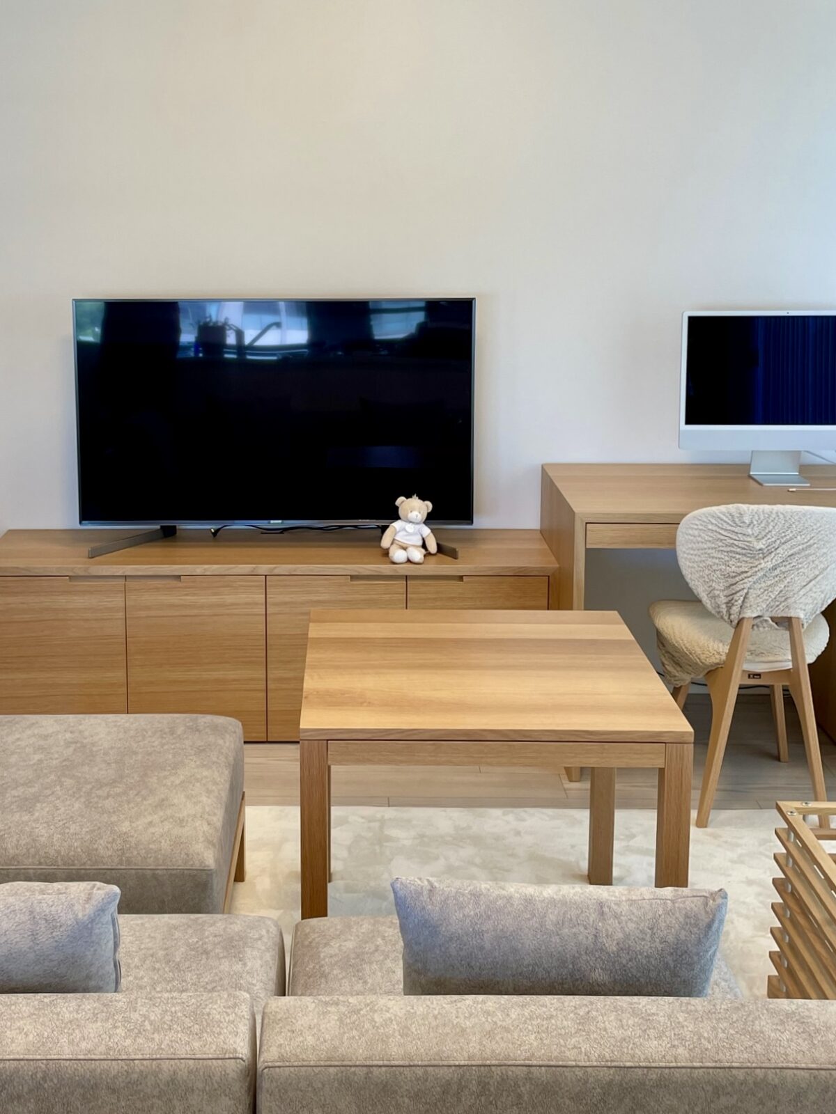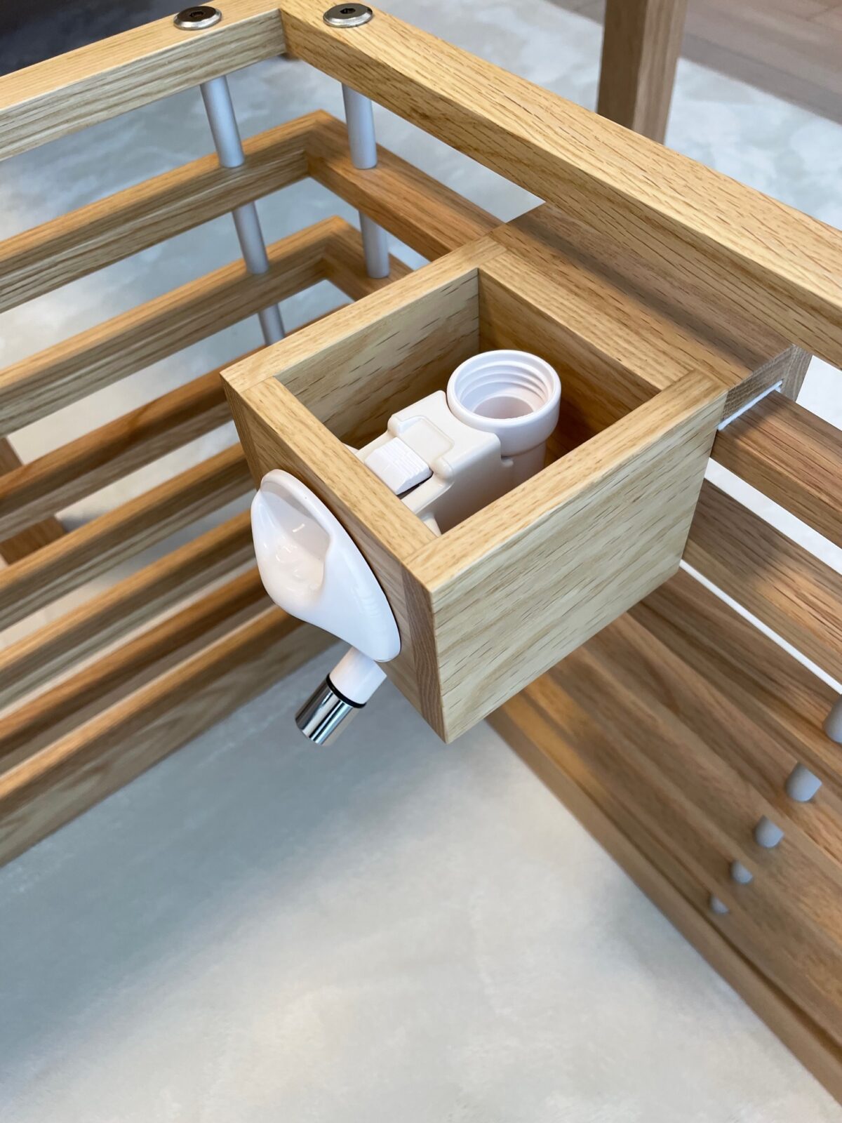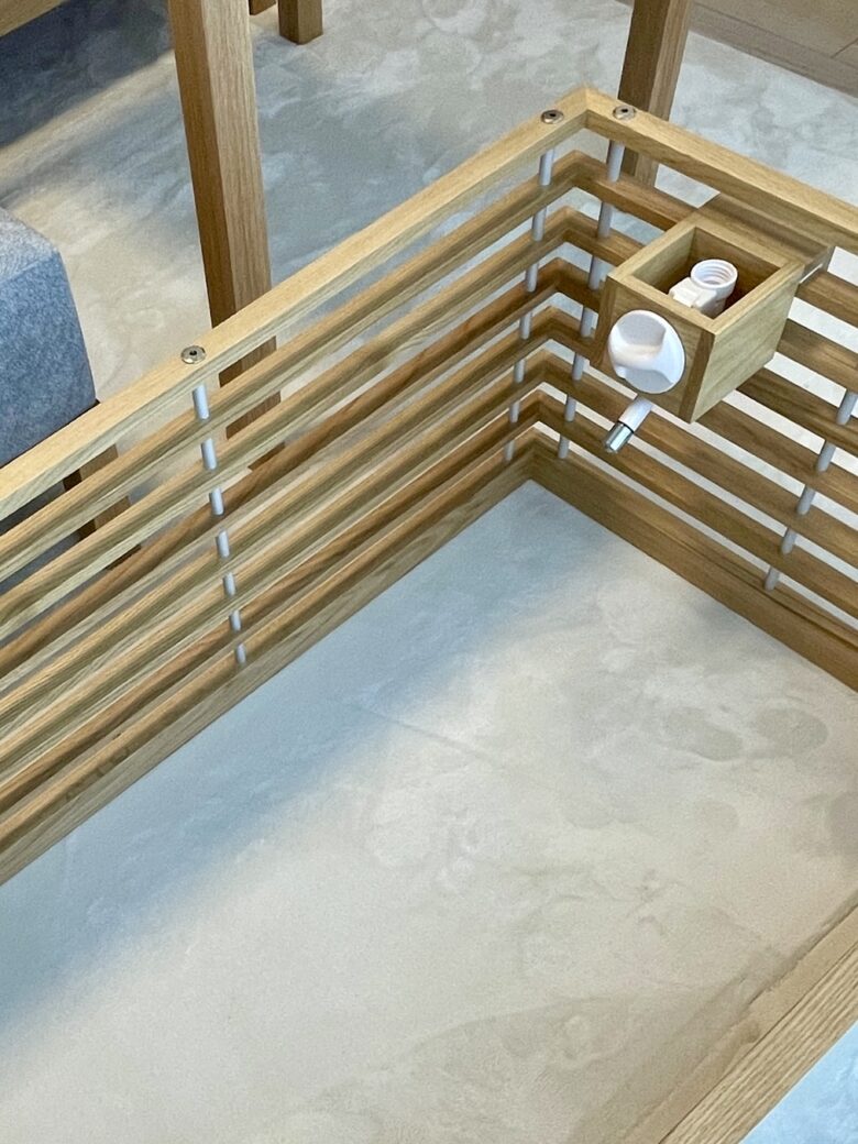 インテリアとの調和を考え、床と同材のアッシュを白染色したルーバーで構成。親が子を想う愛おしい気持ちをデザインする。