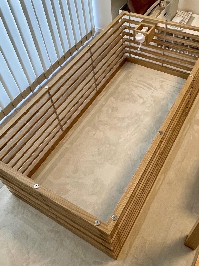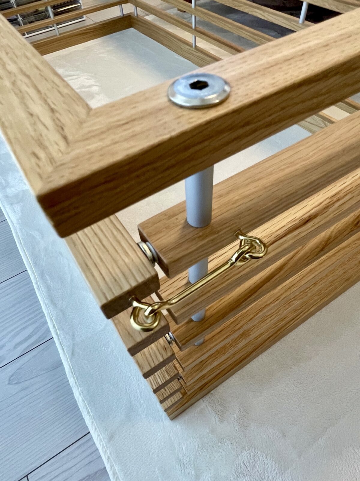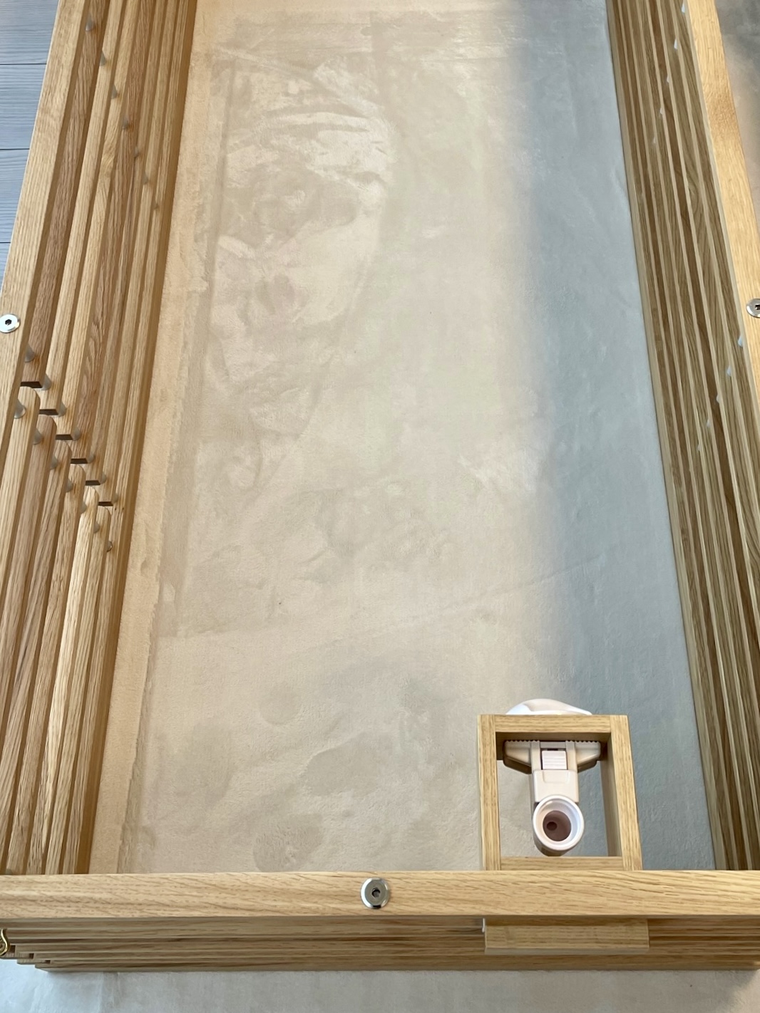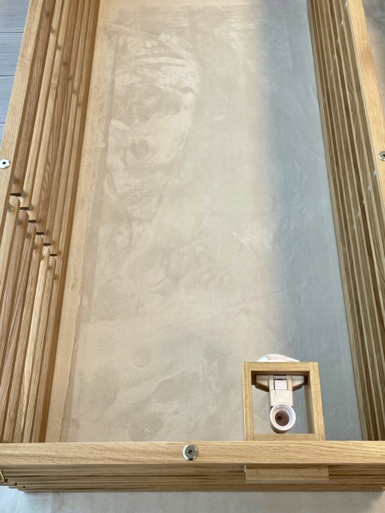 インテリアとの調和を考え、床と同材のアッシュを白染色したルーバーで構成。親が子を想う愛おしい気持ちをデザインする。