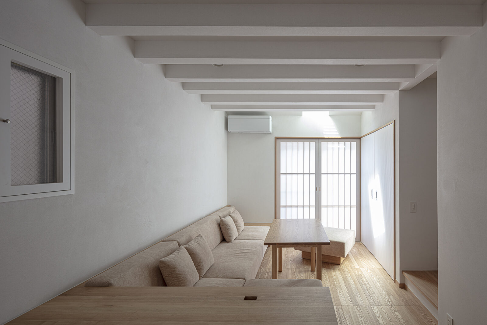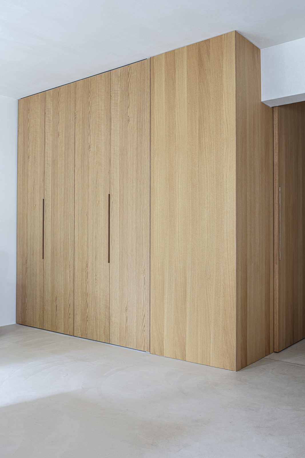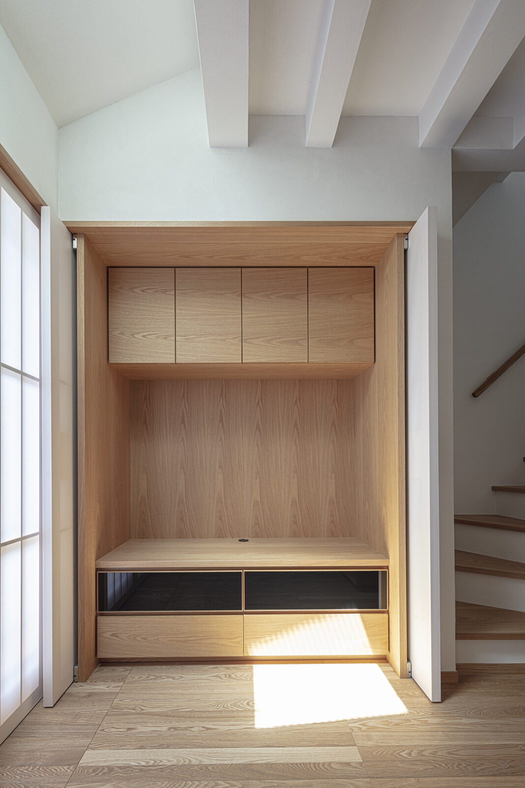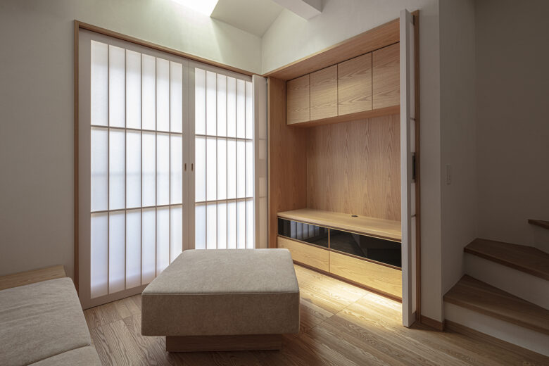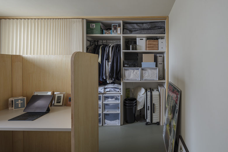 3種類の木を使い分け、個性的に組み上げた造作家具は機能だけでなく、その場の雰囲気を一変させる。住まう人らしさを軸に、見せるものと隠すものを整理しインテリアとの調和をはかった家具デザイン。