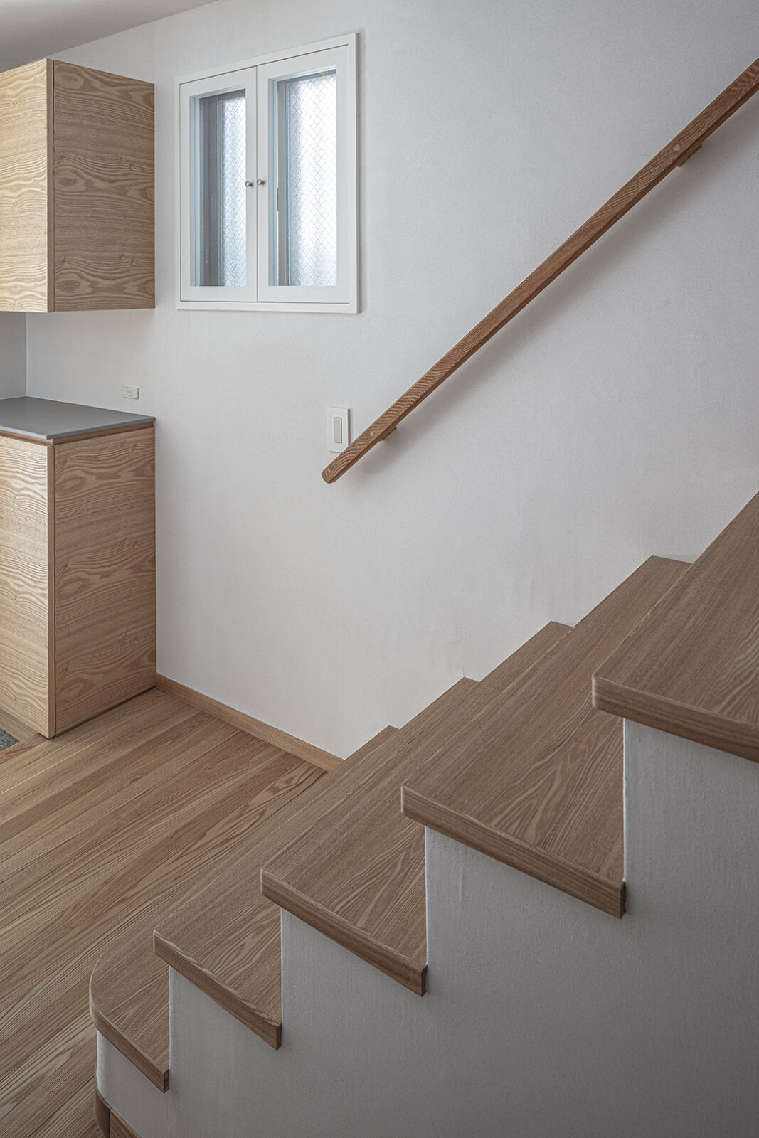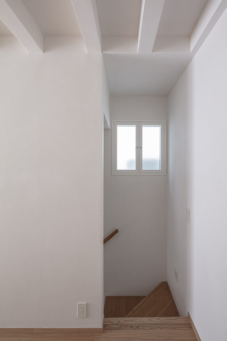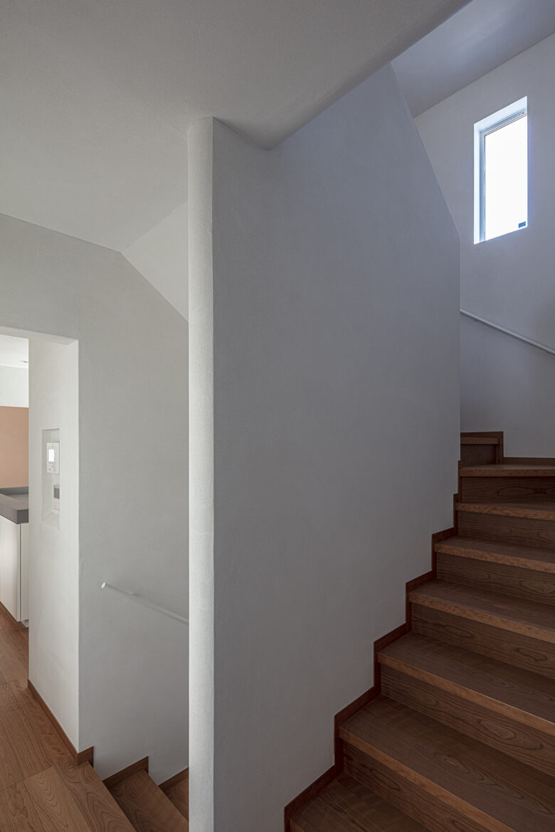 肌触りの良い竹の集成材の階段と土と砂と雲母などを配合した左官の空間に小窓からの自然光が差し込む。