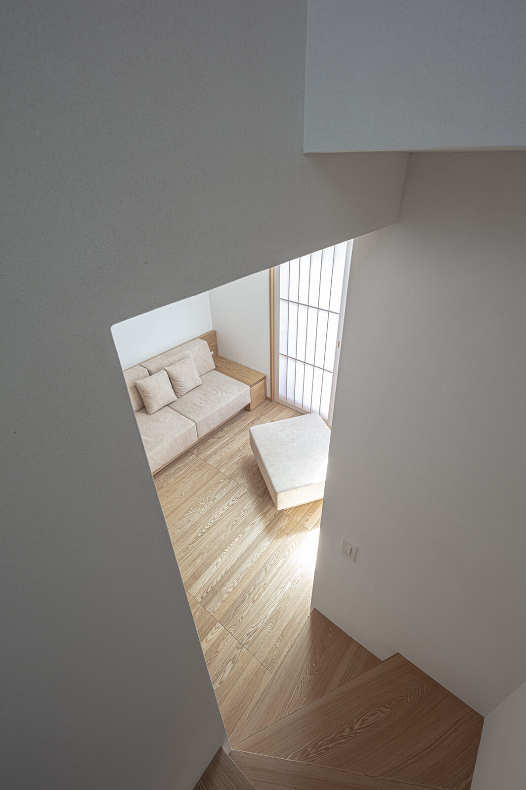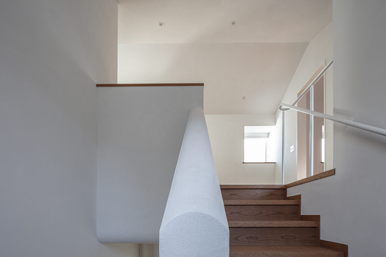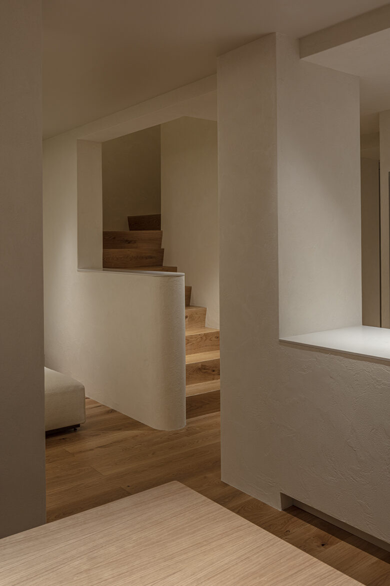 肌触りの良い竹の集成材の階段と土と砂と雲母などを配合した左官の空間に小窓からの自然光が差し込む。