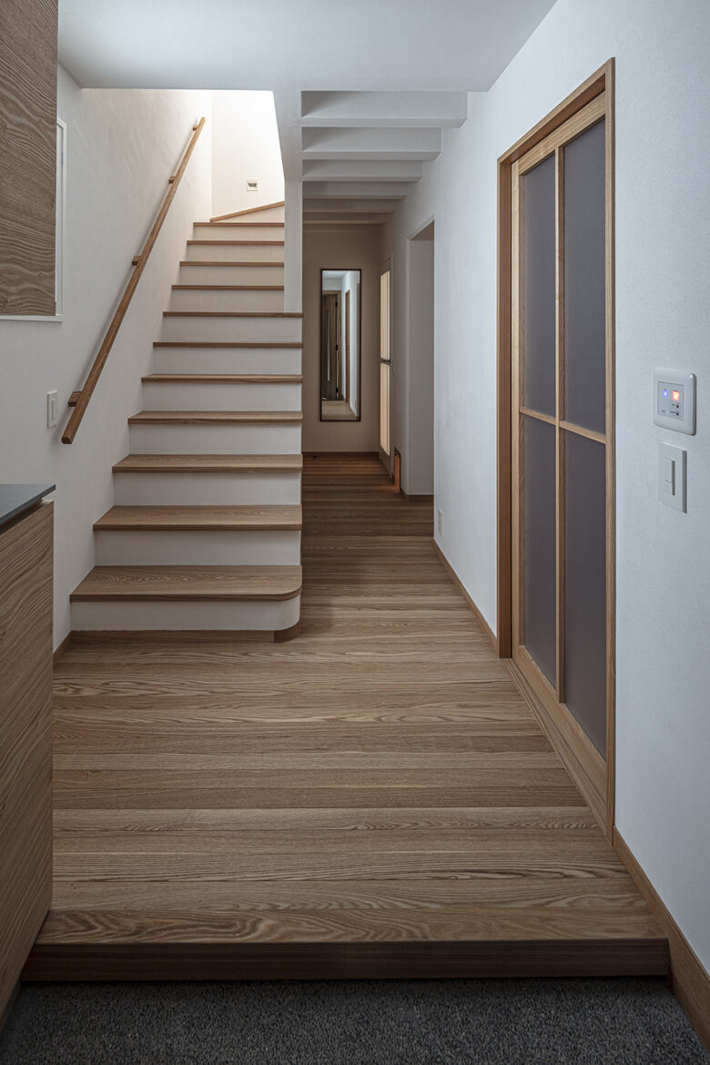 階段は、1階と2階を単に繋ぐというだけでなく、階段、収納棚、間仕切り、手摺を一体にした家具にすることで、実用性とシンボルとしての存在感を強調した。素材は、古びた日本家屋との相性を考え、国産杉を集成した構造用合板を採用した。